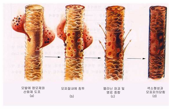 즉, 정리하자면 영구 염색의 원리는 암모니아로 모표피를 느슨하게 한 뒤, 과산화수소와 염료를 모표피 내부로 침투하게 하여 멜라닌 색소를 파괴하고 멜라닌 자리에 염료를 대신 들어가게 하여 머리카락 색을 변하게 하는 것입니다.