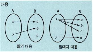 집합 A와 집합 B에서 집합 A의 임의의 원소에 대해 집합 B의 원소가 정해질 때, 집합 A의 원소에 집합 B의 원소가 대응한다고 한다. 이 때 집합 A의 하나의 원소에 집합 B의 원소가 2개 이상 대응하는 경우와, 집합 B에 집합 A의 원소와 대응하지 않는 원소가 있는 경우도 있다. 즉, 집합 A의 각각의 원소에 집합 B의 원소가 적어도 하나 대응될 때를 「집합 A에서 B로의 대응」이라고 한다. 특히 집합 A의 각각의 원소에 대해 집합 B의 상이한 원소가 각각 대응할 때를 「일대일대응」이라 한다.