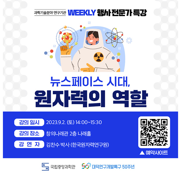국립중앙과학관에서는 ‘대덕연구개발특구 50주년’을 맞이하여 국가과학기술을 이끌어가는 연구기관의 전문가 강연을 진행하고 있습니다. 관심있는 분들의 많은 참여 바랍니다. □ 강연 개요 ㅇ 강의 일시 : 2023.9.2.(토) 14:00 ~ 15:30 ㅇ 강의 장소 : 창의나래관 2층 나래홀 ㅇ 정 원 : 150명 ㅇ 추천 대상 : 초등 고학년 ~ 성인 ㅇ 접수 일시 : 8.21.(월) 09:00부터 선착순 ㅇ 신청 방법 : 누리집(홈페이지)를 통한 온라인 예약(무료)| 강연명 | 『뉴스페이스 시대, 원자력의 역할』 |